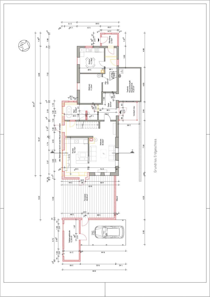 Stellen Sie sich ein Haus als massiven Block vor, den Sie mit einem Messer zerschneiden. Ein Grundriss bildet das Haus ab, indem er eine Projektion der Grundfläche zeigt, wenn man etwa bei einem Drittel der Raumhöhe einen horizontalen Schnitt machen würde – so, als sähen Sie von oben in den Block hinein. Grundrisse werden von jedem Geschoss eines Gebäudes gezeichnet, die Schnittstelle wird durch eine fette Linie markiert. Die Blickrichtung geht immer zur Erde hin, so dass unterhalb des Schnittes liegende Bereiche wie der Fußboden, Treppen, Fenster und Türöffnungen zu sehen sind, darüber liegende dagegen nicht. Grundrisse werden für das Bauamt im Maßstab 1:100, für die Handwerker dann im Maßstab 1:50.